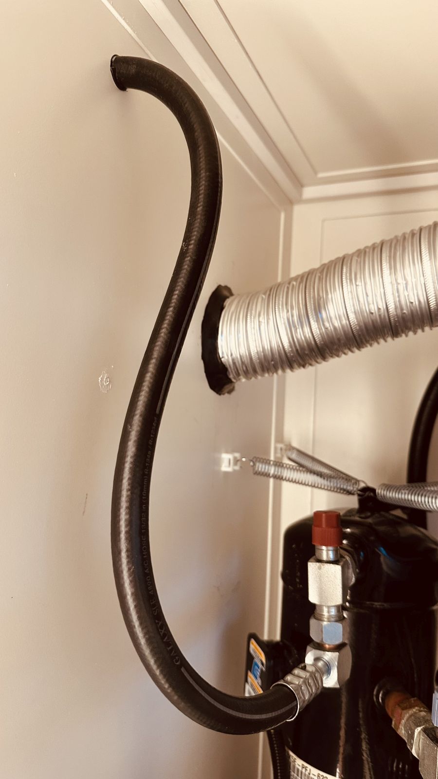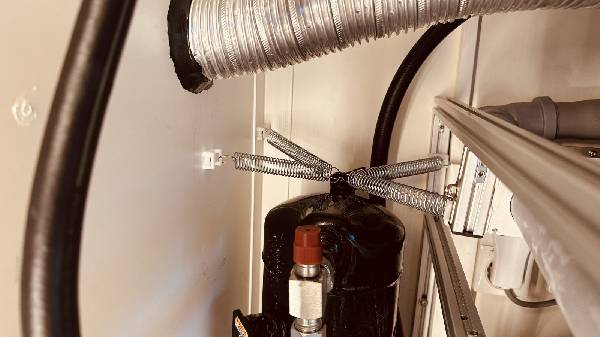 Kältekompressor der Air Kondition: Wir hatten eine Geräuschkulisse in der Kabine was kaum auszuhalten war, an Schlafen war nicht zu denken! Wir besuchten unser Heinzelmännchen in Affoltern am Albis, gemeint ist Hans Gautschi der Klima Spezialist, er meinte nur, tja, da sind paar Sachen zu verbessern. Der Schall den der Klimakompressor an die Kabine weitergab wurde eliminiert durch neue Schwingungsdämpfer. Die Druckschläuche die an der Wand verlegt wurden gaben die Druckstösse des Kältekompressors an die Wand ab, die Kammer wurde zum Resonanzkörper. Der Kältekompressor wurde oben nun mit vier Federn im Zentrum gehalten, er kann nun frei schwingen. Die Schläuche wurden anders verlegt, frei im Raum und man hört nur noch ein Säuseln des Kältekompressors, das ist vernachlässigbar! Die Füllmenge von einem Kilo Kältemittel des Kältekreislaufes wurde abgesogen, das vermisste Schauglas das gemäss Schema von Gautschi eingebaut werden sollte, wurde jetzt eingebaut. Die Anlage wurde langsam unter stetiger Kontrolle mit 1.5 Kilo Kältemittel wieder gefüllt. Bei 1.5 Kilo Kältemittel hört man den Kältekompressor nicht, aber es waren kleine Bläschen im Schauglas sichtbar. Wir haben die Füllmenge erhöht auf 1.6 Kilo Kältemittel, nun hört man ein Geräusch vom Kältekompressor, dafür sind im Schauglas die Bläschen verschwunden. Nun müssen wir in Zukunft entscheiden mit welcher Menge Kältemittel wir fahren wollen, respektive mit welcher Geräuschkulisse. Wir sind noch daran, also noch nicht fertig!