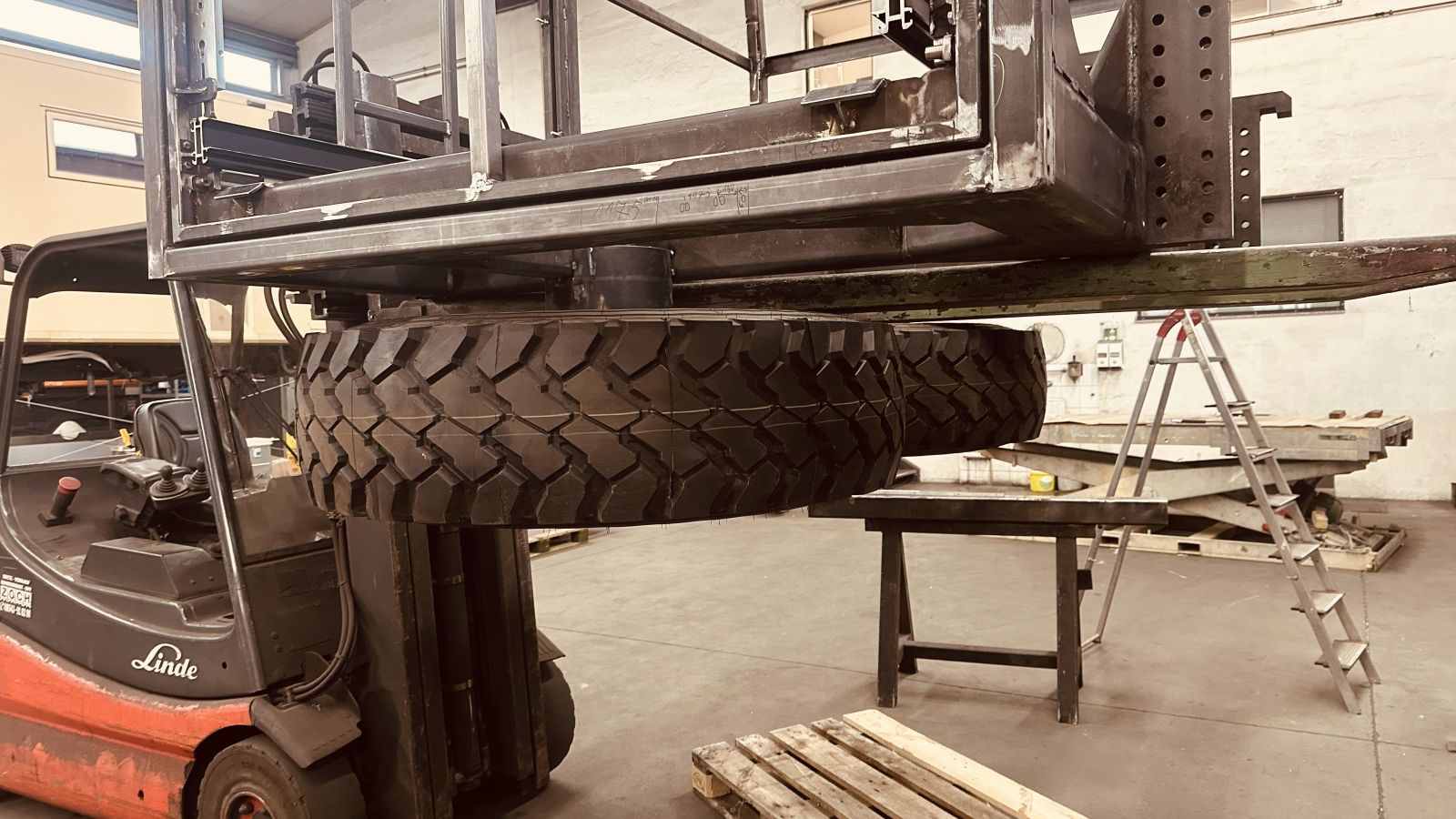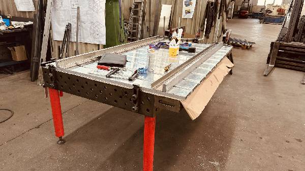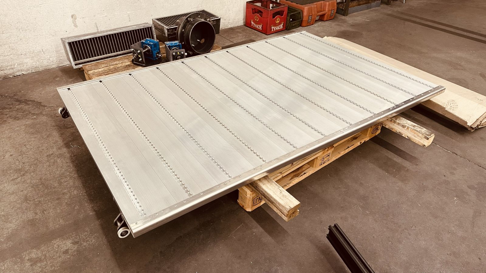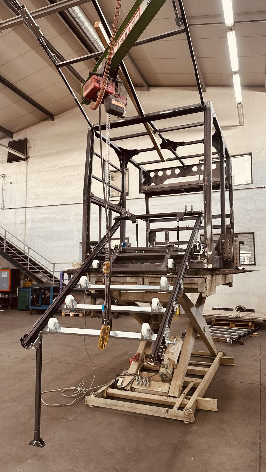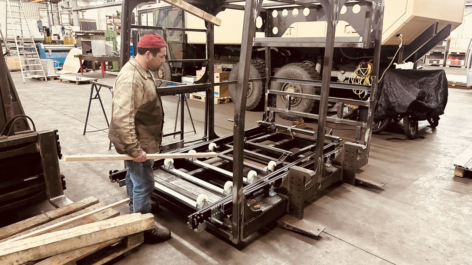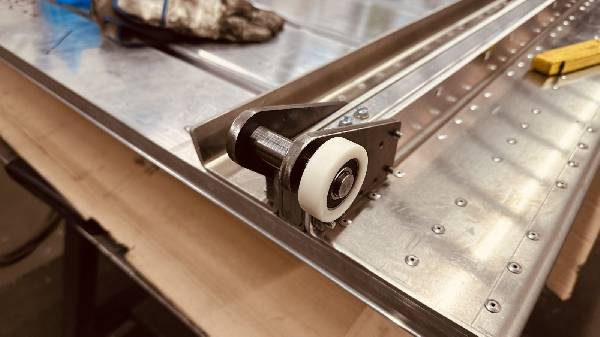 Pritsche: Pritschenprofile, Abkantbleche, Rechteckprofile werden zusammengestellt, ausgerichtet, verbohrt und vernietet! Die Rollen vorne laufen in den Führungen von neo-Dyne, die Rollen hinten benötigen wir am Boden damit der Wagen in die horizontale Lage zu liegen kommt. In der stumpfwinkligen Abkantung wird der Wagen seitlich geführt. Die Pritsche wird mit oder ohne Quad von der Quad Box bis zum Boden auf Rollen geführt.