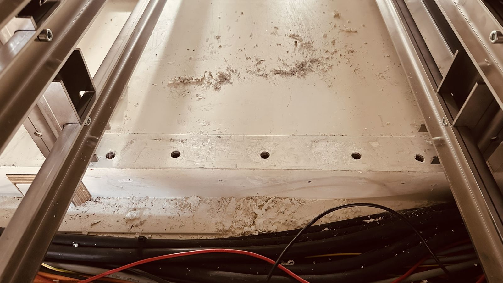 - Zwischendurch montiere ich teilweise den Schubladenblock unter dem Bett, in der Heckgarage den wir auf beide Seiten zu 80 % ausziehen können. Gestern und heute habe ich die beiden 60/60 Winkel demontiert wo der alte Schubladenblock darauf montiert war. Diese Winkel waren formmässig so eingefräst , dass ein verschieben in x- und y-Richtung unmöglich war. Die Winkel waren mit 5 Stück M8 Schrauben befestigt, deswegen stellt sich für mich die Frage: warum wurden die Winkel auf beiden Schenkeln und die Schrauben vollflächig verklebt, "Da staunt der Laie und der Fachmann wundert sich"! Ich habe sage und schreibe über 10 Stunden benötigt bis ich diese Verklebung gelöst hatte.