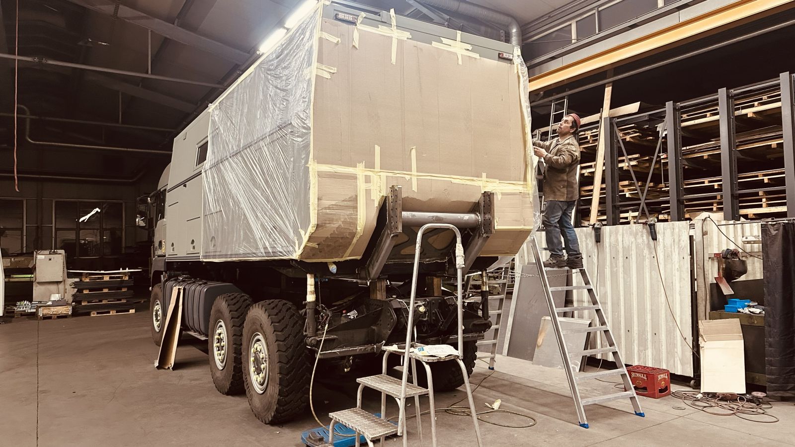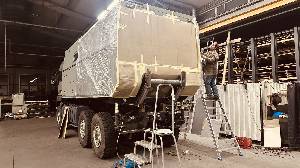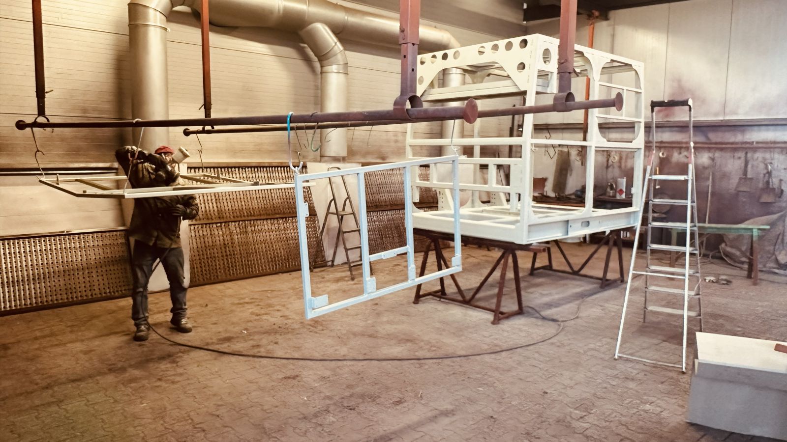 - Die Quad Box und deren Einzelteile wie Winkel für die Stauboxen, Getriebehalter für die Reserveräder usw. sind vom Sandstrahlen zurück, nun wird zwei Mal eine 2K-Epoxy Grundierung aufgetragen.