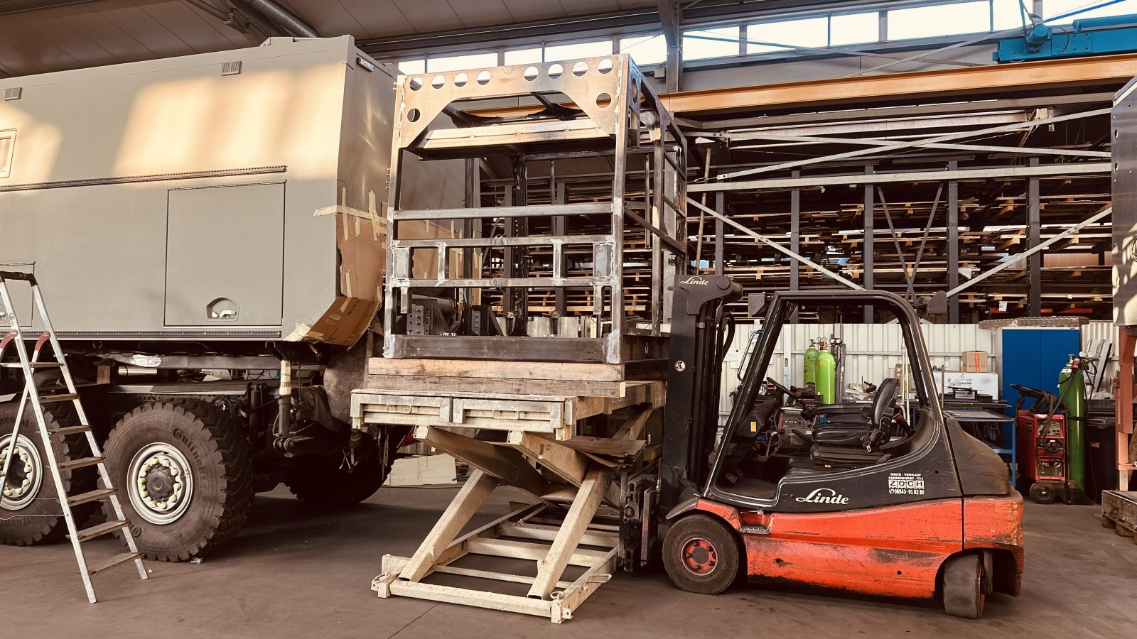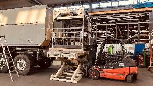 - Die Quad Box wird angehoben, ausgerichtet, platziert und geheftet. Der Platz zwischen Wohnkabine und Quad Box, bedingt durch die massive Kupplung, wird oberhalb und seitlich der Kupplung mit Stauboxen ausgefüllt. Durch die einfache Montage- und Demontage der unteren seitlich angebrachten Stauboxen wird der geforderten kurzen Demontagezeit der Quad Box von 20 Minuten Genüge getan.