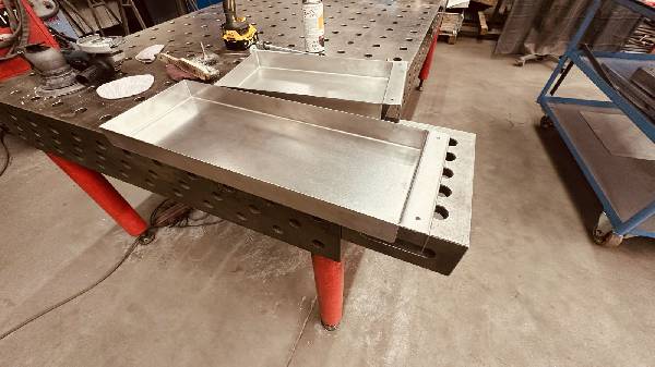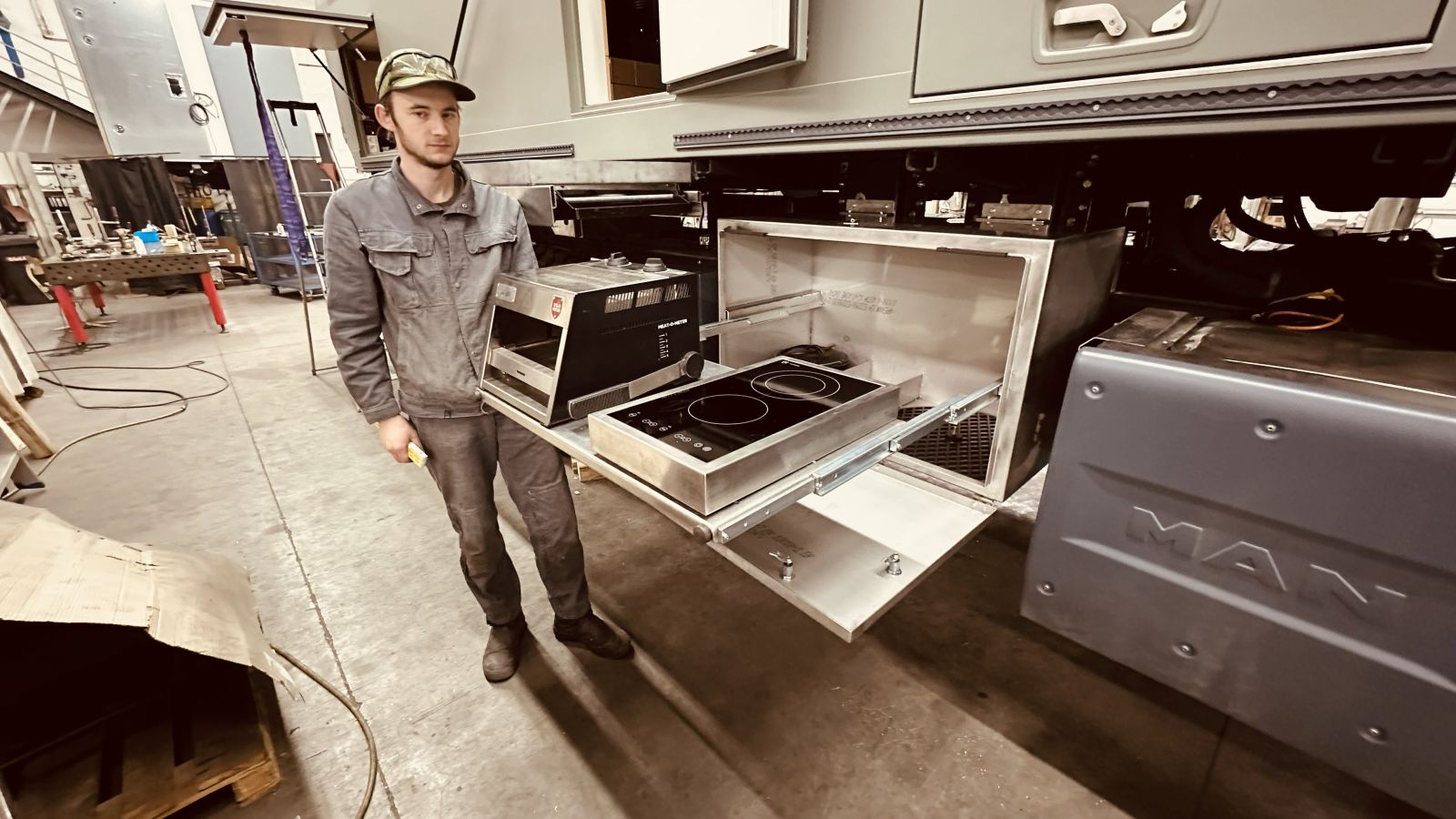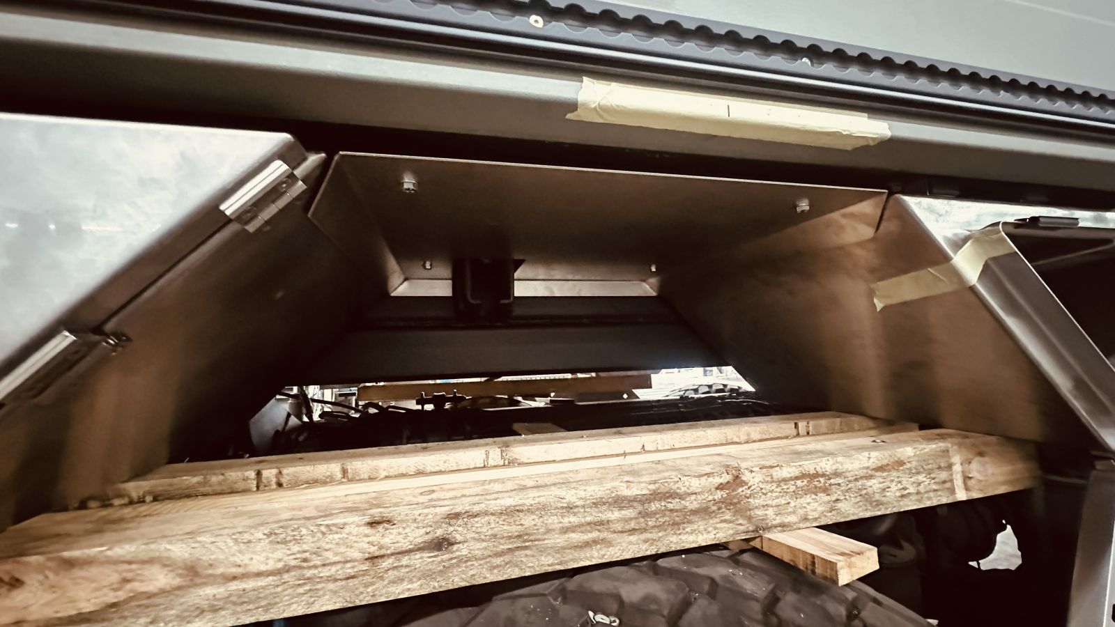 - Die Treppe wird demontiert, die Führungen am Auszug müssen 20 mm gegen die Fahrzeugmitte verschoben werden damit die Stauboxen und die Treppe aussen bündig sind. An der Aussenseite der Längsführung müssen die Ausnahmen die hinten sind auch Vorne gemacht werden weil die Verriegelungen anstehen. Zum anderen sind diese Ausnahmen zugleich gute Griffmulden um die Treppe heraus zu ziehen.