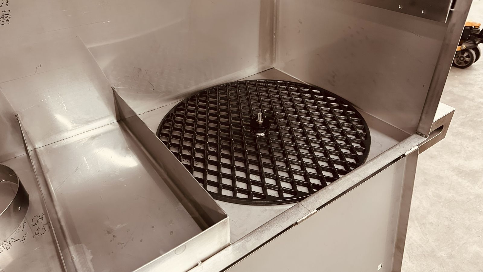 - Die komplette Aussenküche sieht toll aus, man hat Platz zum Kochen und die Arbeitshöhe ist optimal. Mit der Nivellierung des Zwischenrahmens ist die Küche während des Gebrauchs immer in der horizontalen Lage. Die Aussenküche ist verbohrt und der mitgebrachte runde Grillrost mittig mit einer Gewindestange in der Box befestigt. Im mittleren Fach wird ein massgefertigtes Dreibein für den Grillrost und das Kochbesteck gelagert.