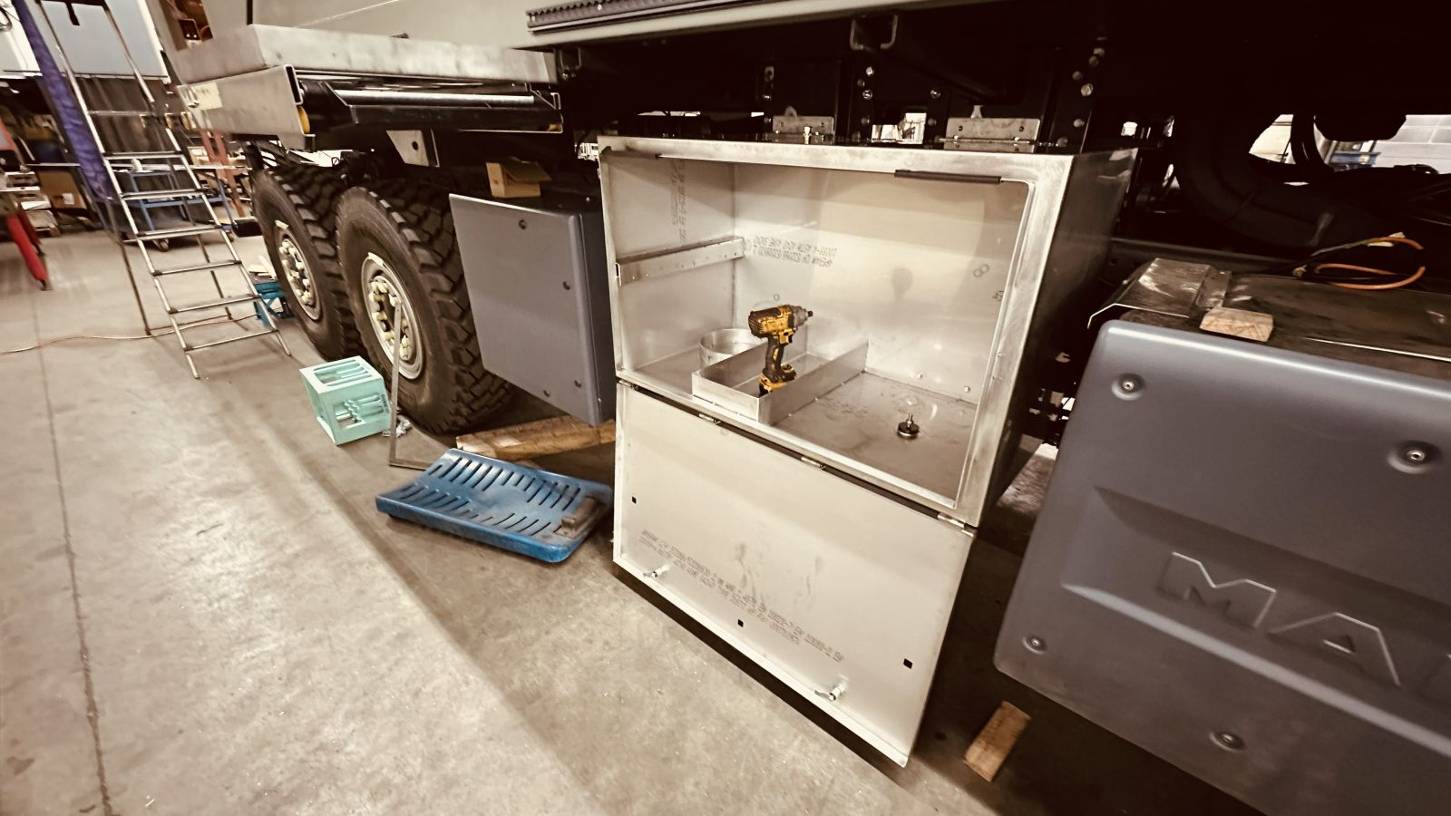 - Während meiner Abwesenheit letzten Freitag und heute Montag wurde gearbeitet und wie. Die Treppe ist vormontiert, ein Steinschlagblech ist ebenso montiert, alle Stauboxen seitlich am Fahrzeug wurden auch montiert nur die Aussenküche seitlich bleibt noch definitiv zu montieren.