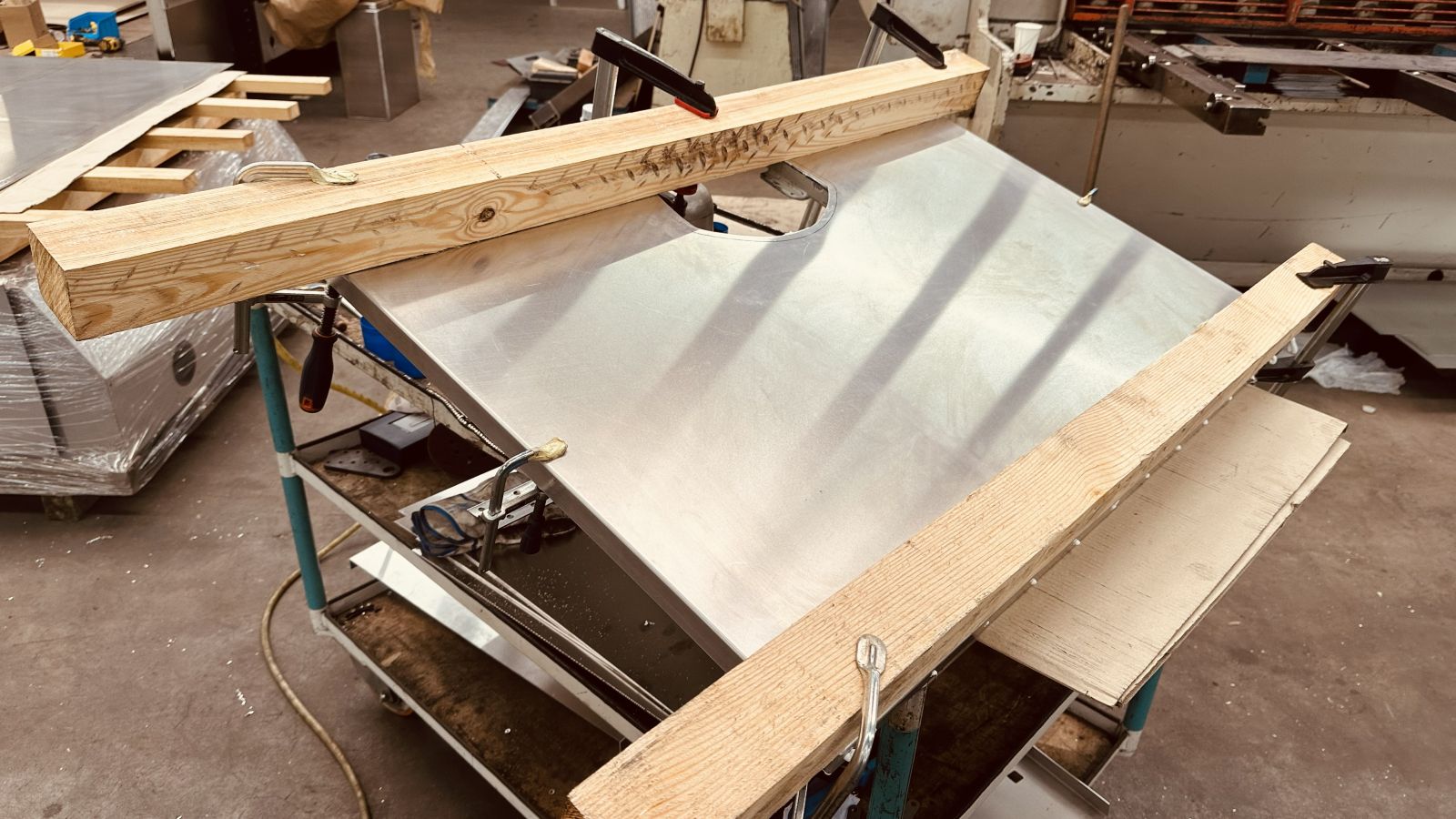 - Die Aluminium Bleche wurden am Montag angeliefert, zugeschnitten für das Dach, vorgebohrt und heute wird das Blech gereinigt, mit primer bestrichen, verklebt und fixiert.