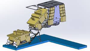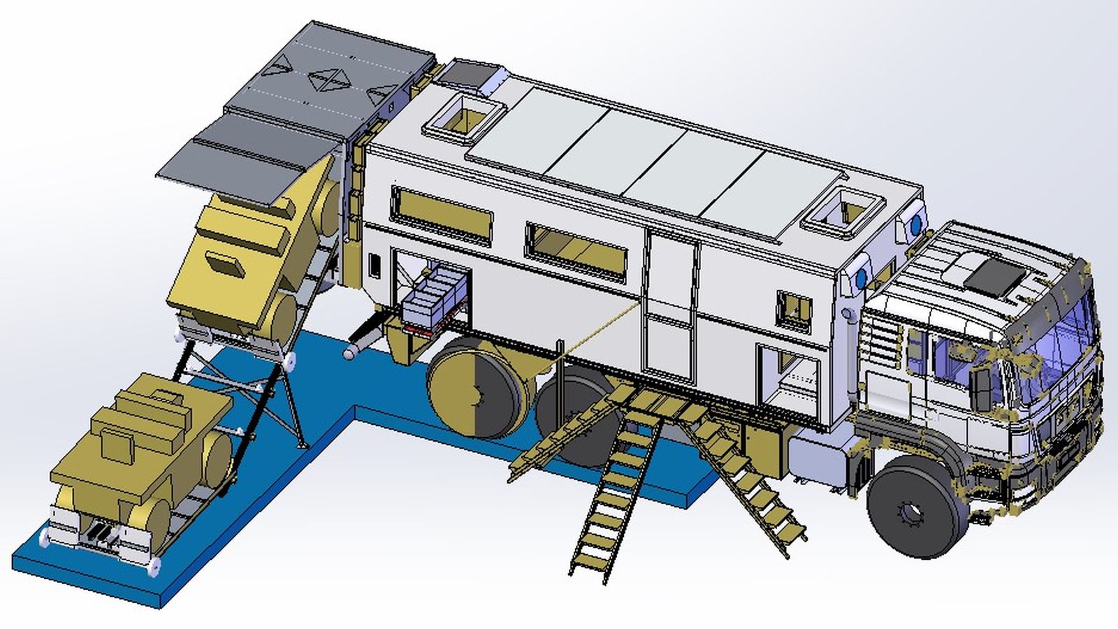 Diese Entscheidung hat Folgen für uns, die Windgeneratoren werden demontiert, der Kran eliminiert und die Ersatzräder werden unter der Quadbox montiert. Der Zwischenrahmen wird hinten mehr belastet, was natürlich nachgerechnet werden muss. Die Tragfähigkeit der Hydraulik muss auch überarbeitet, zumindest geprüft werden und etwaige Einstellungen korrigiert werden. Die Quadbox muss konstruiert, berechnet, anschliessend gefertigt, lackiert und Fahrzeugtechnisch Vorschriftsgemäss elektrisch verdrahtet werden. Eine Vorführung beim Strassenverkehrsamt ist nicht nötig weil es Fracht ist und Vorschriftsgemäss demontiert werden kann. Diese Anpassung mit der Quadbox verlängert die Bohnemoni um 1'237 mm!